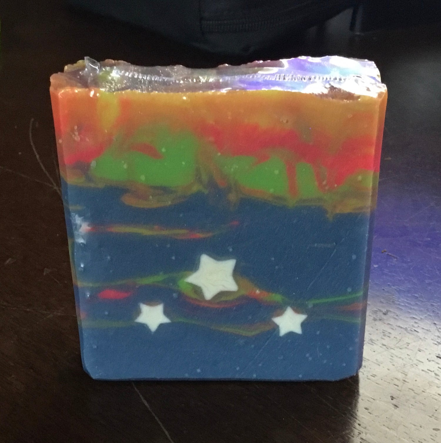 This soap is depicting the aurora borealis. Colorful micas and star soap imbeds add to the fun. This soap has the fragrance oil of Moon Dust by Natures Gardens.This enchanting fragrance oil opens with fruity notes of red berries, succulent tangerine, and citrusy bergamot. The aroma unfolds leading to effervescent notes of champagne, cyclamen, violet leaves sitting on a warm base of gentle cashmere, amber, and musk.