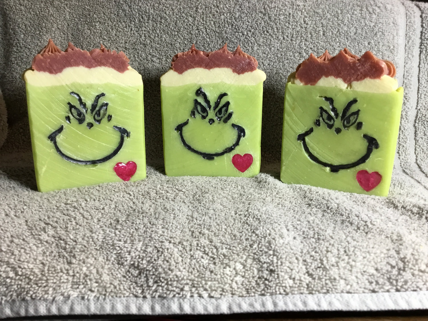 Ingredients: Olive Oil, Palm Oil, Coconut Oil, Castro Oil, Hempseed Oil, Sodium Hydroxide, Distilled Water, Coconut Milk, Sodium Lactate, Micas, melt and pour soap and Christmas Cabin Fragrance Oil.