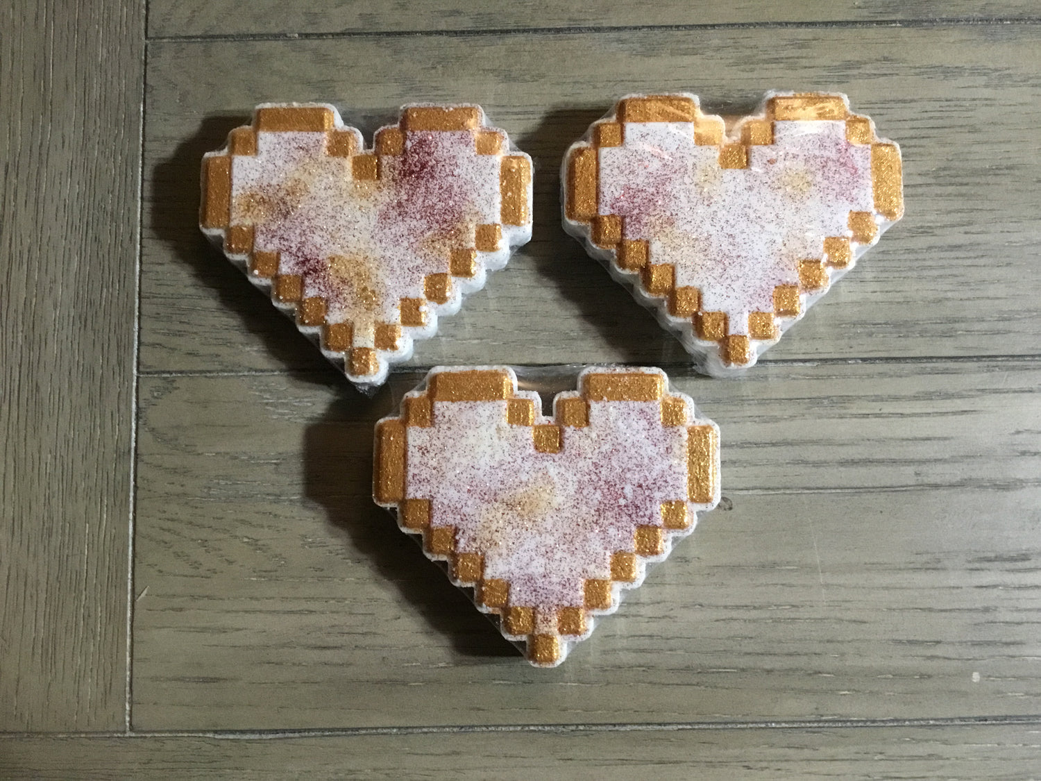 This is a cute heart made with Chanel Chance Fragrance Oil from Northwoods Distributing. Each heart is hand painted with Gold Glitter mica and dusted with fine glitter. Each bath bomb weighs 3.9 to 4.3 ounces.