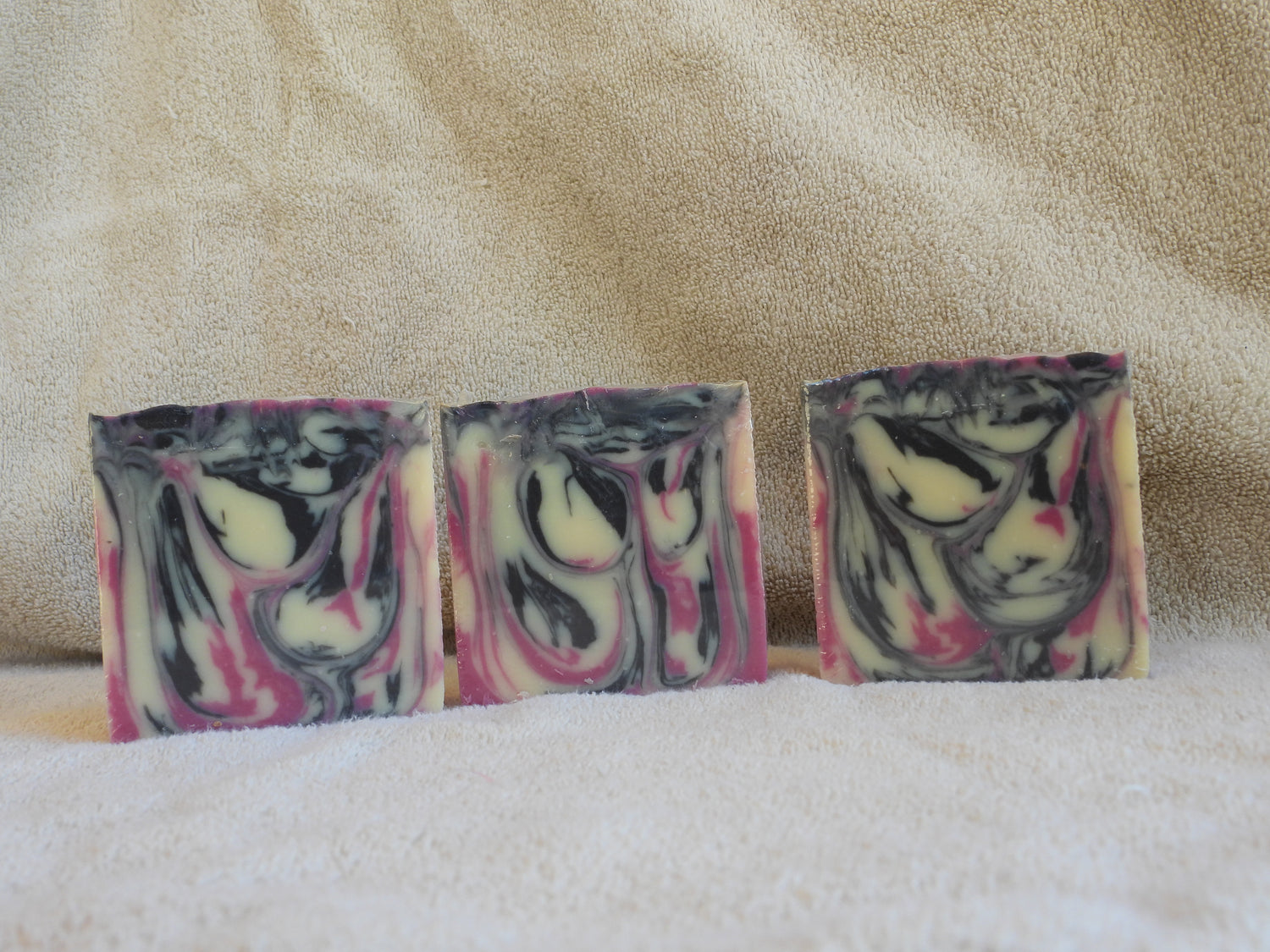 I really like this sweet scent of berries and vanilla. The fragrance oil is from Natures Garden. This scent has top notes of Lemon, Raspberry, Black Raspberry, Strawberry, Coconut. Middle notes of peach, Violet and Honeysuckle, and bottom notes of Plum Blossom, Musk and Vanilla. Each bar weighs 6.0 to 6.5 ounces.