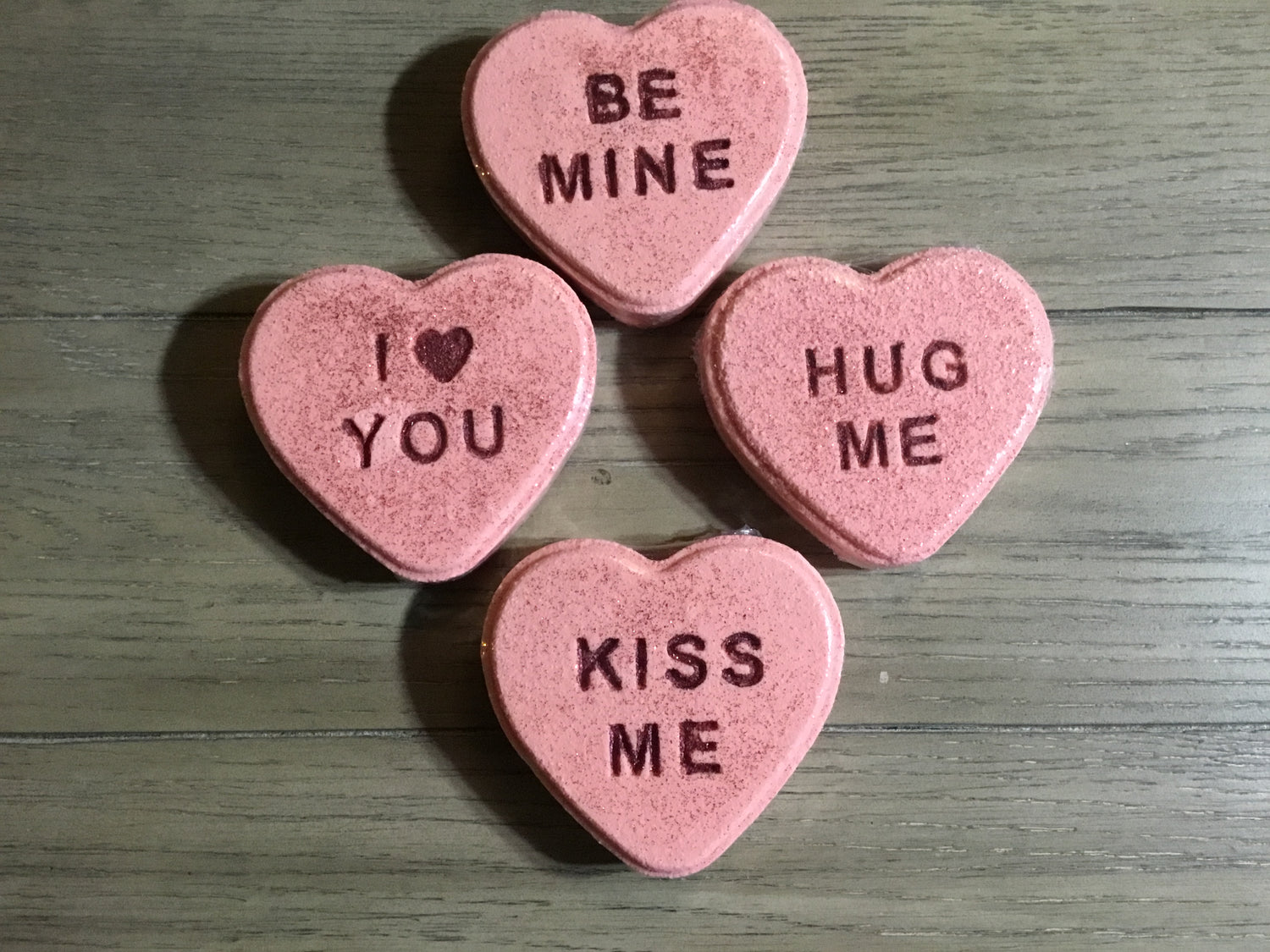 These are cute conversation type hearts that spread love. The scent of this bath bomb is Galactic Skies by Midwest Fragrance Company. This fragrance has Top notes of Bergamot, Lemon-Lime Spritz, Rose Bud, Middle notes: Cardamom, Melon, Jasmine, Grapefruit and Base notes: Exotic Amber, Vanilla, Sandalwood. Each bath bomb weighs 3.2 to 3.6 oz