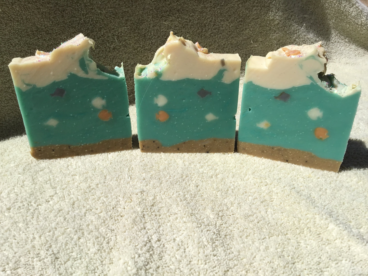 I like this version of the sea scape. Added a little touch of glow in the dark to the fishes for a fun way to take a bath. The scent is Cactus and Sea Salt by Midwest Fragrance Company. The scent has top notes of Cactus, Woods, middle notes of Musk, Floral and base notes of Sea Salt. Each bar weighs 6.0 to 6.7 ounces.