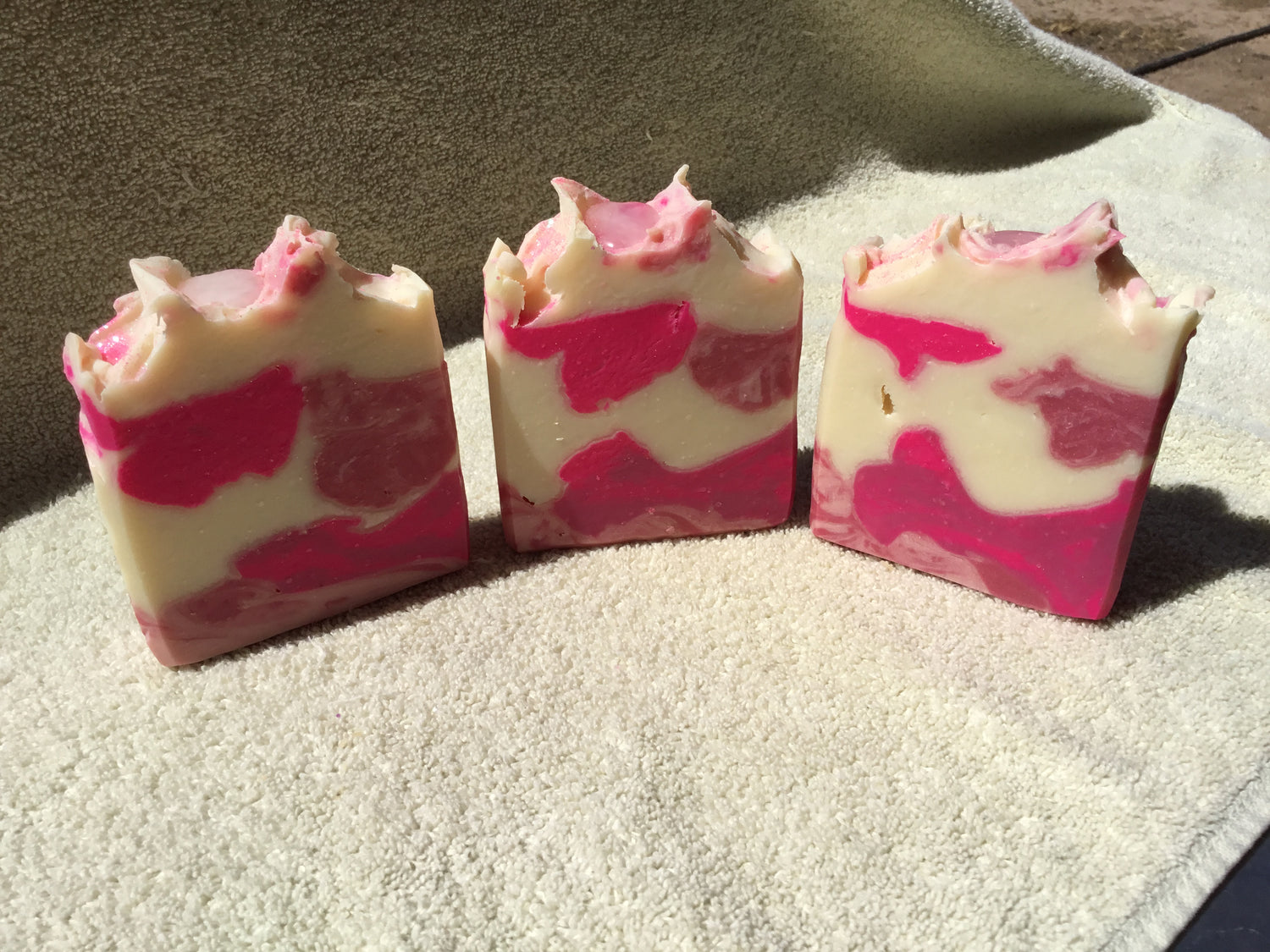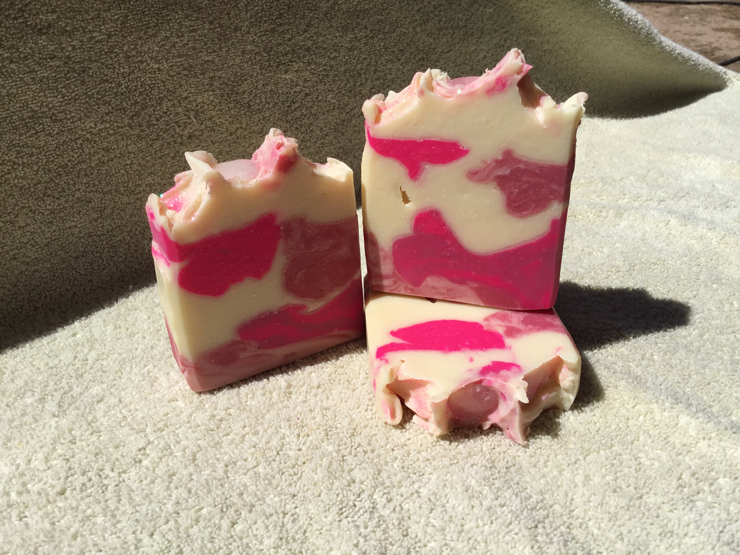 I created this soap with my grand-daughter in mind because she likes different colored stones so embedded in the top of each bar is a Rose Quartz heart. The fragrance for this soap is from Nature's Garden and has the delightful smell beginning with notes of Pomegranate, Blood Orange, and Pink Pomelo. Next, the middle notes of Nectarine Peel, White Grapefruit and Lemon Zest. Last, are bottom notes of White Vetiver, Shiplap Wood Accord, and gentle musk. Each soap weighs 6.0 to 6.7 ounces.